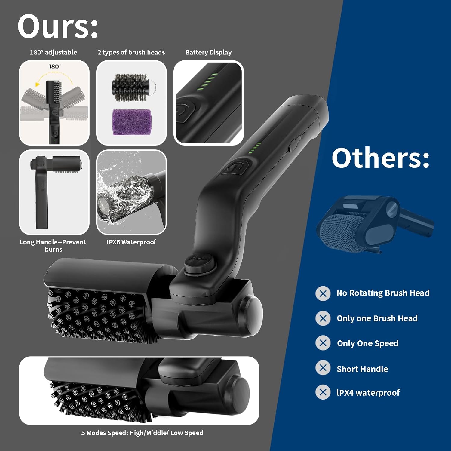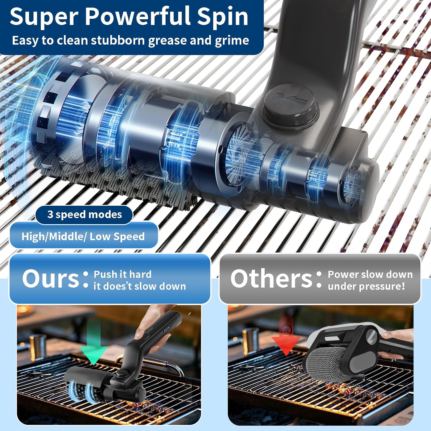 Det professionella roterande huvudet är konstruerat för prestanda och levererar högt vridmoment för att utan ansträngning skära igenom envis fett och inbrända rester. Det förvandlar en tråkig syssla till en 2-minutersuppgift och lämnar din grill fläckfri och redo för din nästa grillfest.